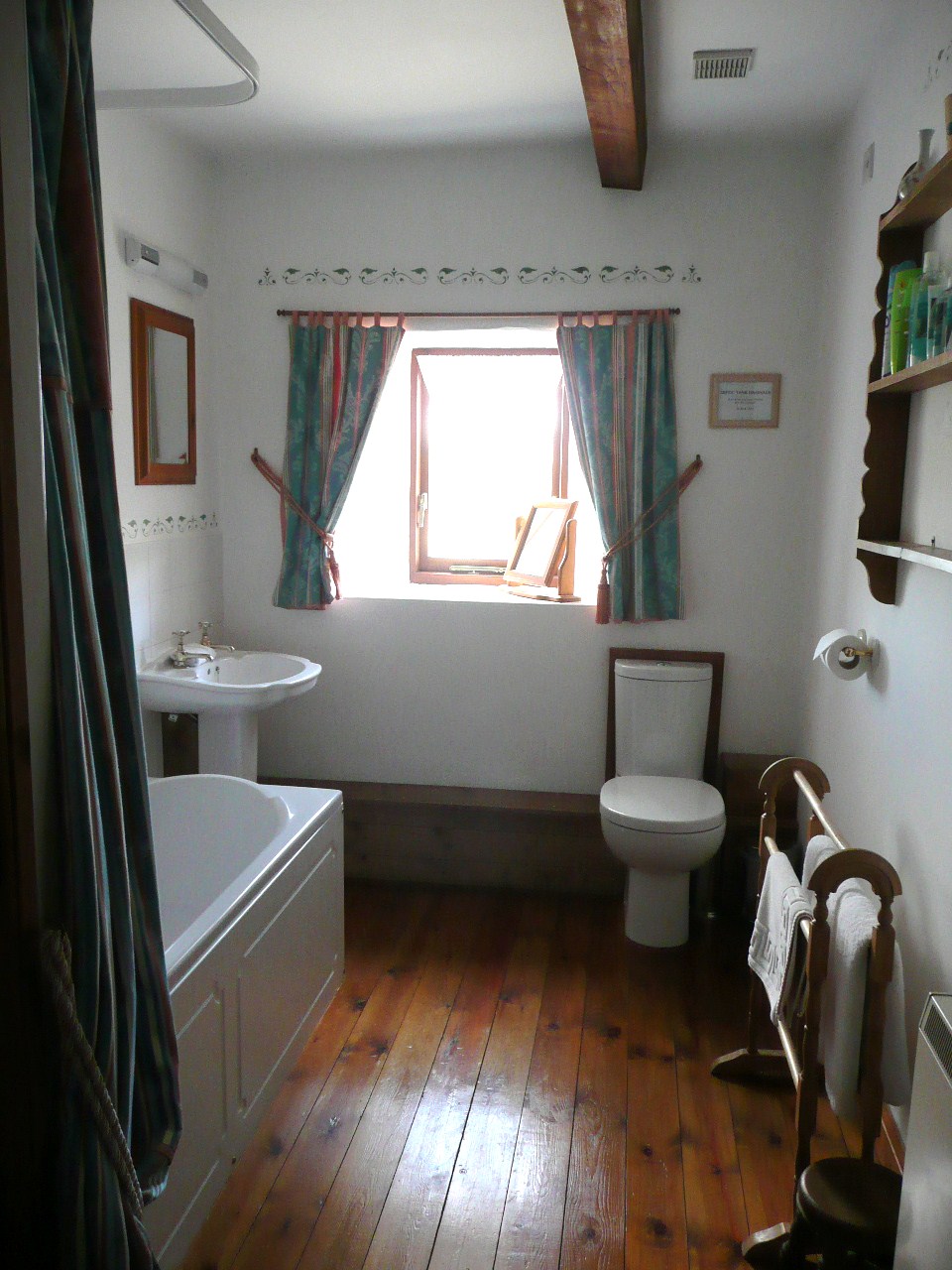 A pine staircase leads upstairs: Two bedrooms, one twin and a very large double bedroom, house bathroom. In all rooms the floor is pine boarded with scatter rugs. All the beds have super soft, luxurious, down-like, micro-fibre duvets and pillows and quality white bed linen.