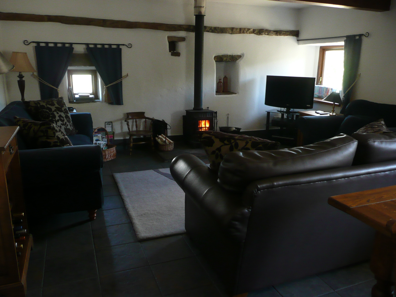 The ground floor is open plan: White washed walls, stone features, wooden beams, Italian tiled floor and a multi-fuel stove create a warm country atmosphere:
